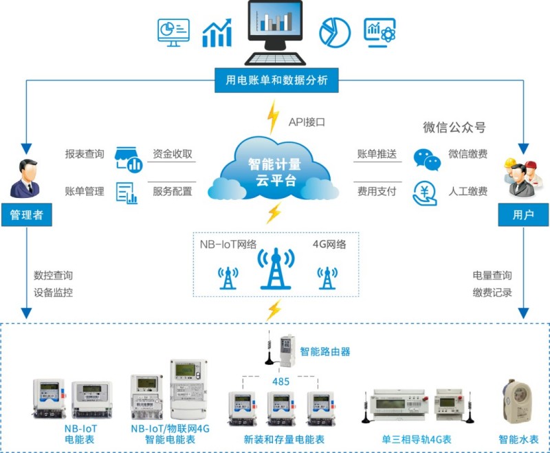智能计量解决方案主要针对石油化工企业生活区抄表收费难,人工成本过高等问题,将水、电表和系统平台融合,以极低的投入实现水电便捷式管理。